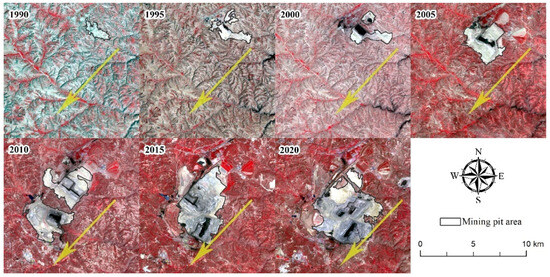 Temporal and spatial variation map of mining pit scope in Zhungeer mining area (The direction of the yellow arrow in the picture is the advancing direction of the Zhungeer open-pit coal mine).