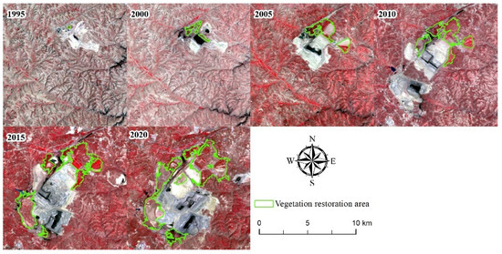 A synchronized comparison of Figure 5 and Figure 6 reveals that the Zhungeer mining area underwent extensive vegetation restoration around 2005, particularly in the northeastern section of the study area, where two substantial spoil sites began to take shape. The false-color imagery indicates that the vegetation in this region is thriving, characterized by a high canopy cover. Subsequently, between 2010 and 2020, two additional large vegetation restoration areas gradually emerged in the southwestern part of the study area, with these zones continuing to expand, highlighting the significant success of the restoration efforts.