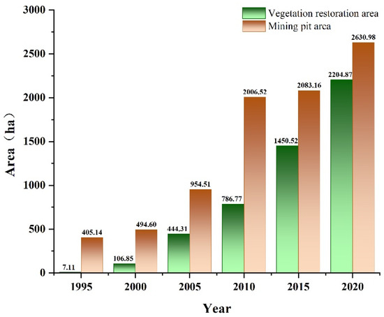 Statistical chart of mining pit and vegetation restoration area in Zhungeer mining area.