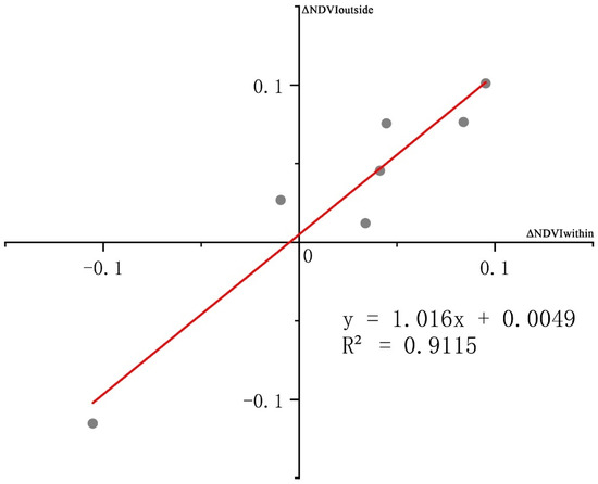In regard to the NDVI values outside the mining area, the mean NDVI consistently remained higher than that of the internal mining area at all time points, with similar patterns of change. This indicates that the vegetative condition in the external region is also gradually enhancing (Table 4). We may preliminarily conclude that the ecological initiatives implemented within the mining area have had a positive impact on the external environment. To further analyze the contribution of the internal mining area to the ecological quality of the external environment, we employed regression analysis to establish a relational model between the changes in mean NDVI within the mining area and those in the external region. A linear regression approach was utilized: