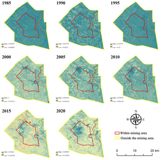 (3) From 1985 to 1995, due to the influence of mining development, the mean NDVI within the mining area decreased from 0.04 to 0.0301, indicating a deterioration of vegetative conditions in the study area. However, after 2000, the mean NDVI progressively increased, restoring to 0.2246, which signifies recovery of the internal ecological environment. Additionally, there is a notable radiative effect of the mining area on the external vegetation conditions, achieving a contribution value of 1.016.