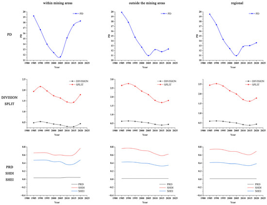 After analyzing the results of SHDI, SHEI, and PRD, we found that PRD remained at a low level in all areas, indicating that the study area had a relatively simple patch structure and low landscape richness. In terms of SHDI, the internal SHDI of the mining area experienced a decline from 1985 to 2010, followed by an increase post-2010. This denotes that the construction and mining activities associated with the open-pit coal mine initially reduced landscape diversity, with some original landscape types being supplanted by the emergence of mining pits. A similar downward trend was observed in SHEI during this timeframe, indicating that the predominance of bare land patches resulting from mining expansion has led to persistent disruption of the ecosystem and a decline in stability. However, post-2010, both SHDI and SHEI indicators have progressively recovered, with PRD also experiencing modest improvement, surpassing levels recorded before the onset of mining in 1985. This suggests a restoration of landscape diversity within the mining area. Through analysis of the company’s ecological restoration measures and methods, it was found that during vegetation reconstruction, tree forests, shrub forests, farmland, and grasslands were established, resulting in new landscape types within the mining area. This result also suggests that the landscape patches in the mining area became more uniform. Although the expansion of mining pits continued to dominate with bare land, the type changes in other patches and their connectivity have reduced the dominance of bare land [10,40,41]. Comprehensive analysis of these three indices reveals that the landscape structure within the mining area became imbalanced following mining activities, yet with the implementation of ecological restoration projects, the landscape structure has gradually regained balance, resulting in progressive improvements in the ecosystem and heightened stability, along with an increasing richness of habitat types.