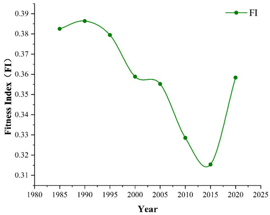The comprehensive calculation of the aforementioned indicators yielded a Fitness Index (FI), as illustrated in Table 11 and Figure 12, with weights assigned as follows: W1 = 0.2, W2 = 0.4, and W3 = 0.4. It was observed that the FI of the Zhungeer Open-pit Coal Mine was 0.3825 prior to its construction. As the coal mining activities progressed, the FI gradually declined, reaching a nadir of 0.31532 in 2015, after which it began to exhibit an upward trend. By 2020, the FI had rebounded to 0.35836. Generally, an FI greater than 0.7 indicates high adaptability, an FI between 0.4 and 0.7 signifies moderate adaptability, and an FI below 0.4 reflects low adaptability. This indicates that over the 35-year study period, the adaptability index of the Zhungeer Open-pit Coal Mine consistently remained below 0.4, categorizing the region as having a low base level of adaptability; however, since 2015, it has gradually approached a state of moderate adaptability.