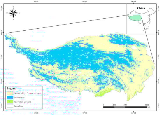 The study was conducted on the QTP. The QTP has the largest extent of permafrost terrain among the mid- and low-latitude regions worldwide, with permafrost occupying 40% and seasonally frozen ground making up 56% of its total area [14] (Figure 1). The mean annual temperature ranges between −3.1 and 4.4 °C, and the mean annual precipitation ranges from 103 to 694 mm [24]. There are four main vegetation types on the QTP: alpine steppe, alpine desert, alpine swamp meadow, and alpine meadow. Alpine desert and alpine steppe are distributed mainly in the western tundra of the QTP, whereas alpine meadow and alpine swamp meadow are located predominantly in the eastern part [25]. The soil types of the QTP are Xerosols for the alpine steppe and Cambisols for the alpine meadow, based on the World Reference Base for Soil Resources classification [26,27]. The average active layer thickness is 2.3 ± 0.60 m [28], and currently unstable permafrost types account for approximately 21% of the total permafrost area of the QTP [29].