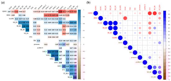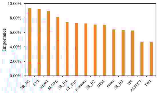 Figure 2 shows the filtering of the collected environmental variables and the variables after filtering. The variables include data from five bands (SR_B2, SR_B3, SR_B4, SR_B6, and ST_B10), the DEM, slope, aspect, TPI, EVI, TWI, NDWI, mean soil temperature over a thickness of 0–100 cm, and mean annual precipitation. Figure 3 shows the contribution of each variable in the modelling process when the RF was taken as an example. The results revealed that the SR_B6 band was the dominant controlling factor, explaining 9.35% of the variation. Other important factors were the EVI, NDWI, and slope, with explanatory percentages of 9.21%, 8.92%, and 8.15%, respectively. The mean annual precipitation, SR_B2, and DEM were all in the ranges of 7.22%, 7.07%, and 7.05%, respectively. The contribution of the mean soil temperature was also in the range of 6.41%. In comparison, the TWI and aspect had the lowest contributions, and their values were 4.6%.
