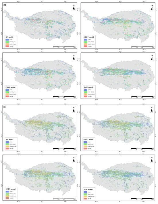 Distribution of thermokarst lakes obtained via the RF, GBDT, CART, and SVM models: (a) in 2015 and (b) in 2020.