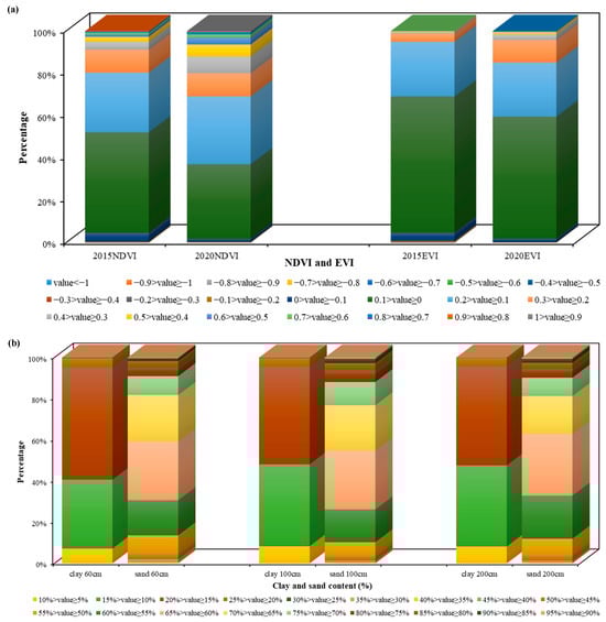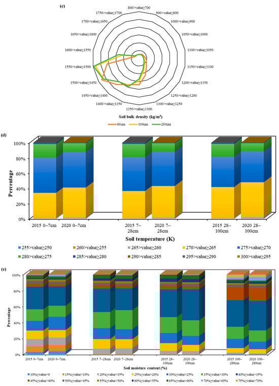 The results showed that, for the NUSC, most of the thermokarst lakes were located at elevations of 4000–5000 m, with slopes between 0 and 5 degrees. Most of the thermokarst lakes had clay and sand contents ranging from 15 to 20% and 60 to 65%, respectively (Figure 5). The thermokarst lakes had the same values of soil bulk density at soil depths of 100 cm and 200 cm, with values between 1.50 × 103 and 1.55 × 103 kg/m3, respectively, and their values were between 1.45 × 103 and 1.50 × 103 kg/m3, respectively, at a soil depth of 60 cm.