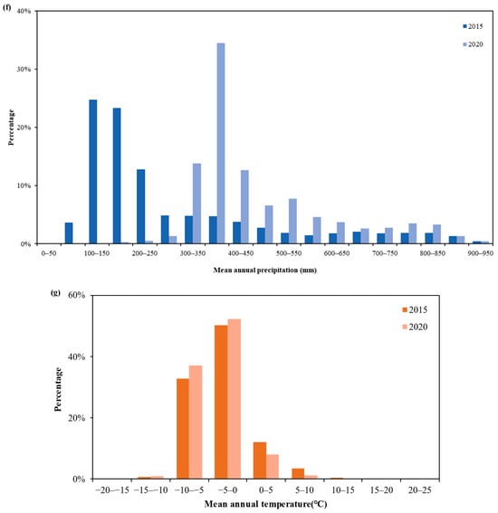 For the UDC, the NDVI and EVI figures for thermokarst lakes predominantly varied between 0 and 0.10 in 2015, increasing to between 0.10 and 0.20 in 2020. The thermokarst lakes were distributed mainly in areas with mean annual precipitation ranging from 100 to 150 mm in 2015 and 350 to 400 mm in 2020. The changes in annual temperature from 2015 to 2020 were not significant, and most of the thermokarst lakes were located between 0 °C and −5 °C. Most of the thermokarst lakes were associated with soil temperatures and soil moisture concentrations ranging from 270 to 275 K and 35 to 40%, respectively. Overall, the NDWI and EVI were the main controlling factors influencing the formation of thermokarst lakes, and the other important regulating factors included precipitation, temperature, DEM, and slope.