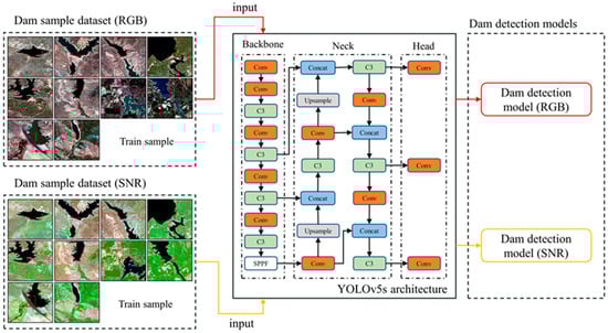 During the training phase, YOLOv5s automatically performs data augmentation operations on the training set, including random flipping, cropping, rotation, and mosaic stitching, to improve the model’s generalization ability and accelerate convergence. In addition, YOLOv5s employs an automatic anchor technique that generates or fine-tunes anchors based on the distribution of target boxes in the training set. After training, the YOLOv5s (RGB) model for the RGB bands and the YOLOv5s (SNR) model for the SNR bands were obtained (Figure 1).