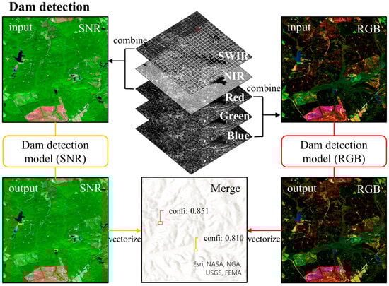 In the dam detection stage, Sentinel-2 imagery is divided into RGB and SNR band combinations and input into the models. The output includes detection boxes and confidence scores. The detection boxes represent the locations of the dams detected by the model, while the confidence score reflects the probability that the location is a dam. The detection results from both models are then merged (Figure 2) and vectorized into rectangular boxes.