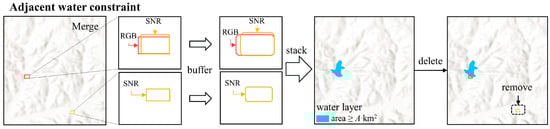 Dams, as essential water infrastructures, are typically constructed in large natural water bodies. Therefore, water bodies with area (≥A km2) are selected as references. The dam detection boxes are then evaluated to determine whether they are located within these larger water bodies. Due to seasonal fluctuations in water body boundaries, applying an appropriate buffer to the dam detection box can ensure its intersection with the water body, thereby reducing missed detections. A buffer of B meters is applied to the dam detection box. If the buffered detection box intersects with a water body, it is retained and assigned the corresponding water body ID; otherwise, it is discarded (Figure 3). The retained boxes will subsequently undergo additional constraints to optimize the detection results.