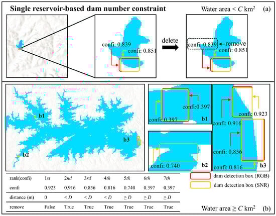 Meanwhile, smaller reservoirs typically have only one dam. Therefore, a threshold of C km2 is used to distinguish between reservoir sizes. When the water area of reservoir ≥ C km2, there can be two dams; otherwise, only one dam can exist. To retain auxiliary dams and reduce false detections in large reservoirs, the single reservoir-based dam number constraint is applied to detection boxes sharing the same water body ID (Formula (1)).