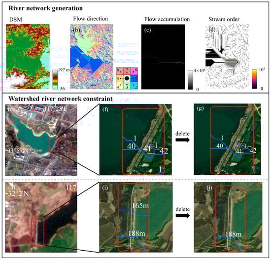 In the watershed river network constraint, the river network is first generated based on AW3D30 (Figure 5a–d). The specific steps are as follows. (1) Use fill to fill the missing or anomalous elevation values in AW3D30; (2) Use flow direction to determine the flow direction of each pixel in AW3D30; (3) Use flow accumulation to calculate the runoff for each pixel and select pixels with runoff ≥ 100; (4) Assign stream order (Shreve’s order) to the pixels [43]. If the detection box contains no river network, discard it. If multiple river networks are included, only the river network with the highest catchment capacity will be retained (Formula (2)).