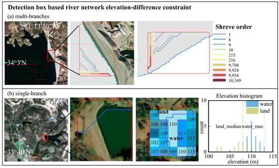 An example of detection box-based river network elevation difference constraint (Image Source: Sentinel-2/Google Earth). (a) For river networks with multi-branches, the total water–body intersection ratio of the upstream branch set is greater than or equal to that in the downstream branch, the detection box is retained; (b) For river networks with only one branch, max(Hwater) (113 m) exceeds median(Hland) (108 m), water flows toward the land part, the detection box is retained. (The red box is the buffered detection box of YOLOv5s (RGB) or YOLOv5s (SNR)).