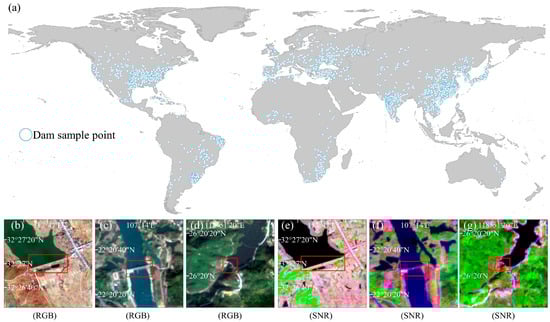 Spatial distribution of dam sample points and examples of dam samples in different Sentinel-2 band combinations. (a) The Spatial distribution of dam sample points; (b–d) The dam annotation box in RGB band combination; (e–g) The dam annotation box in SNR band combination. (The red box is the annotation box).