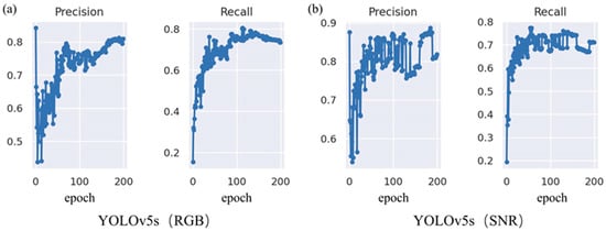 Validation accuracy of YOLOv5s (RGB) and YOLOv5s (SNR) models in the training process. (a) Precision and recall curves during the training process of YOLOv5S (RGB) model; (b) Precision and recall curves during the training process of YOLOv5S (SNR) model.