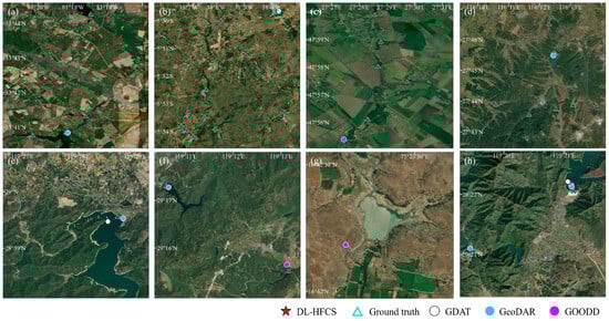 Comparison of DL-HFCS detection results with global dam datasets (Image Source: Google Earth). ((a–d) Comparison in terms of quantity; (e–h) Comparison in terms of positional deviation).