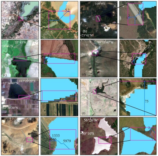 We filtered dams in the prediction set based on the constraints in the HFCS and counted the number of dams that did not meet the constraints. In reservoirs with an area ≥ 1 km2, there are 11 reservoirs where the distance between two dams within the reservoir is <500 m, whereas in reservoirs with an area < 1 km2, 137 reservoirs contain two dams. According to the single reservoir-based dam number constraint, 148 dams in the prediction set could not be detected because they did not satisfy the condition.