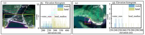 Examples of dam annotated boxes in the prediction set that do not meet the elevation difference constraint under one branch (Image Source: Sentinel-2). (a) Dam annotated box does not meet the constraint; (b) The elevation histogram of annotated box in a; (c) Dam annotated box does not meet the constraint; (d) The elevation histogram of annotated box in c. (Purple represents the water part, and brown represents the land part).