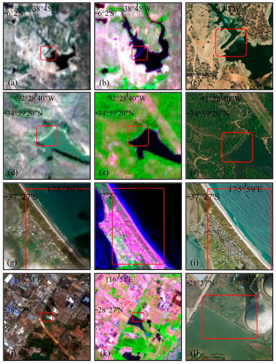 Examples of false detection boxes (the first column is Sentinel-2 RGB bands, the second is Sentinel-2 SNR bands, and the third is Google Earth high-resolution images) ((a–c) water-based artificial structure; (d–f) natural riverbank; (g–i) natural riverbank; (j–l) land-based artificial structures). (The red box is the buffered detection box of YOLOv5s (RGB) or YOLOv5s (SNR)).