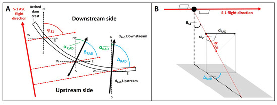 Relationship between true radial dam deformations and their projection onto the LOS geometry of the sensor: (A) Variations in (blue) as a function of the true north radial angle of the corresponding PS point (, green), and the S-1 look direction ( = 84°, red dashed arrow). The effect is illustrated for the ascending flight direction. (B) A 3D representation of the projection of true radial deformations onto the sensor’s LOS geometry [35].