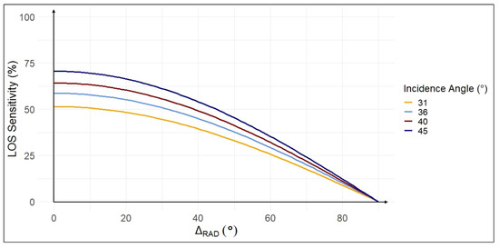 LOS sensitivity (%) to radial deformations, expressed as a proportion of the true radial deformation (mm). The sensitivity of deformations projected onto the LOS of the sensor is described as a function of and . LOS sensitivity is presented for all datasets used in this study, along with their corresponding values.