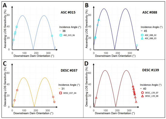 LOS sensitivities (%), expressed as the proportion of the true radial deformation (mm), analyzed for all datasets and their corresponding PS points on the dam: (A) ASC #015. (B) ASC #088. (C) DESC #037. (D) DESC #139. The theoretical maxima between ascending and descending datasets differ by 12° in for congruence. Ascending points are shown in cyan, descending points in red. The shape of each point indicates its affiliation with the respective data stack.
