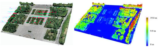 The advancement of remote sensing technology has positioned UAV-based photogrammetry as a cost-effective alternative, particularly due to its dual capacity to capture spectral information and generate 3D point clouds through structure from motion (SFM) and multi-view stereo (MVS) processing of high-resolution RGB imagery [,]. This technique has demonstrated significant utility in individual tree segmentation [], structural parameter extraction, and tree species classification []. For instance, Nevalainen et al. [] processed high resolution photogrammetry images into point cloud data using an image matching algorithm and then segmented the individual trees with accuracy from 40% to 95%. Similarly, Fawcett et al. [] reported 98.20% accuracy in oil palm height estimation using SFM-derived point clouds, while Karpina et al. [] attained an average vertical accuracy of 5 cm for Scots pine height measurements in plantation settings. These successes underscore the efficiency of UAV-based photogrammetry in homogeneous environments with limited species diversity. However, its application to urban tree species classification remains unexplored, particularly in areas with high species heterogeneity.