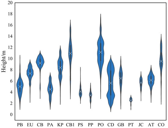 Violin plots of the height distribution for different species. Note: The species codes are shown in Table 1.
