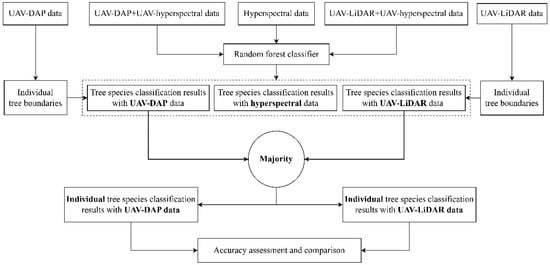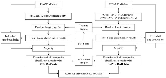 The individual tree boundaries extracted above were overlaid on the tree species classification maps derived from random forest classifier. Then, the individual tree species were determined by the tree species with the highest percentage in one individual tree boundary through ArcGIS 10.8 software in our study. Therefore, individual tree boundaries derived from UAV-DAP and UAV-based LiDAR data were overlaid on the random forest classification maps with UAV-DAP derived parameters and UAV-based LiDAR derived parameters, respectively. The flowchart of this part is shown in Figure 9.