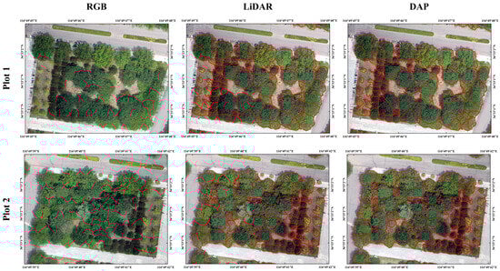 - Suggestions: LiDAR should prioritize applications requiring vertical structural fidelity (e.g., carbon stock estimation), while DAP suits large-scale spectral-textural mapping tasks (e.g., biodiversity surveys). DAP should also be adopted as a cost-effective alternative in budget-constrained programs, balancing its high precision with operational affordability. As for budget-constrained urban forestry programs, UAV-DAP can be a cost-effective alternative by balancing its high precision with operational affordability.