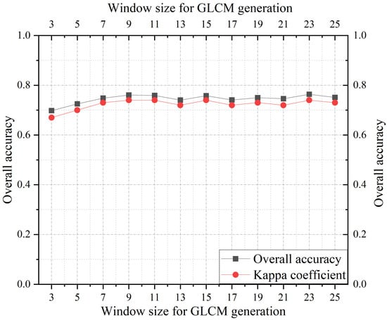 As textural features have shown their excellent performance in tree species classification using UAV-based photogrammetry, it is necessary to explore the optimal window size for texture generation. Therefore, in this paper, textural features extracted based on different window sizes were combined with other spectral and structural features for urban tree species classification. In our study, the second-order probability statistical filtering tool of ENVI 5.6 software was used in GLCM generation by setting different window sizes. Figure 12 shows the trend of tree species classification accuracy under different textural generation window sizes. When the window size is less than 10, the classification accuracy greatly improves with the increasing of the window size while, when the window size is greater than 10, the classification accuracy slightly decreases in fluctuations. Therefore, 9 × 9 is chosen as the optimal window size for texture generation. As the spatial resolution is 0.1 m, the 9 × 9 window size is 0.9 m × 0.9 m.