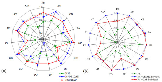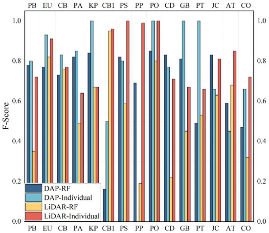 For some tree species, whether DAP or LiDAR data are used, the classification accuracy is high, such as KP, PO, and GB. On other certain tree species, there is a significant difference in individual tree species classification between UAV-DAP and UAV-based LiDAR data. For example, the accuracy of PP has been increased significantly in individual tree species classification with UAV-based LiDAR data, whereas that of PP has decreased notably with UAV-based photogrammetry.