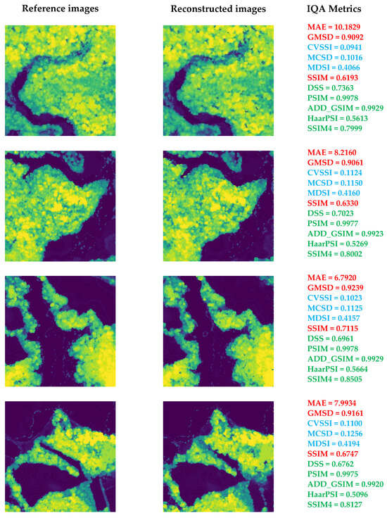 While our diffusion-based reconstruction algorithm demonstrates promising results in super-resolving HHDCs from sparse measurements (as will be shown in Section 6), it is imperative to evaluate the quality and reliability of the reconstructed data. The inherent lossy nature of the compression and reconstruction process can introduce deviations from the ground truth, potentially impacting downstream applications such as ecological modeling and biomass estimation. Therefore, a thorough analysis using image quality assessment (IQA) metrics is necessary to quantify the fidelity of the reconstructed HHDCs and ensure their suitability for practical use. In the following sections, we delve into the evaluation of various IQA metrics to assess their effectiveness in capturing the quality of reconstructed forest landscapes.