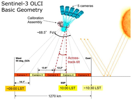 OLCI images the Earth over a 44 min window on the descending path (daytime) of each orbit, with observation beginning when the sun zenith angle (SZA) at the sub-satellite point goes below 80° and stopping once it again reaches 80°. The 68.5 FOV and 1270 km swath width mean the global coverage revisit for the Sentinel-3 constellation is 1.1 days at the equator, and 2.2 days for a single satellite. These revisit times decrease as latitude increases due to orbital convergence [7]. The OLCI is a programmable, medium-spatial-resolution imaging spectrometer, sensing in the reflective solar spectral range in twenty-one spectral bands (390–1040 nm). These bands are programmable from the ground in width and position in 1.25 nm steps (Table 1) [1]. The 1270 km field of view is shared between five identical cameras with a slightly overlapped configuration, where each camera is covering a 14° field of view.