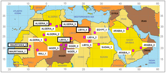 The location of the desert sites used for the SADE/MUSCLE PICS calibration. The sites, whose names are highlighted in black boxes, are the 6 PICS recommended by CEOS and used for DIMITRI PICS calibration.