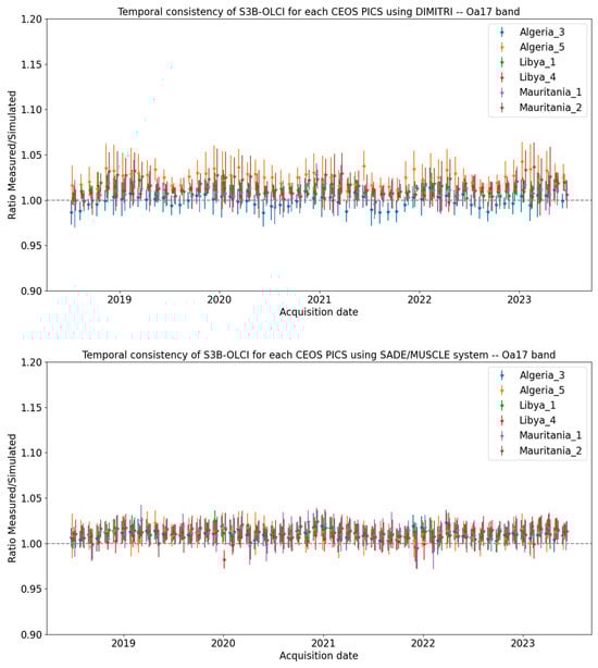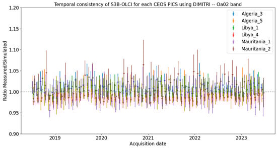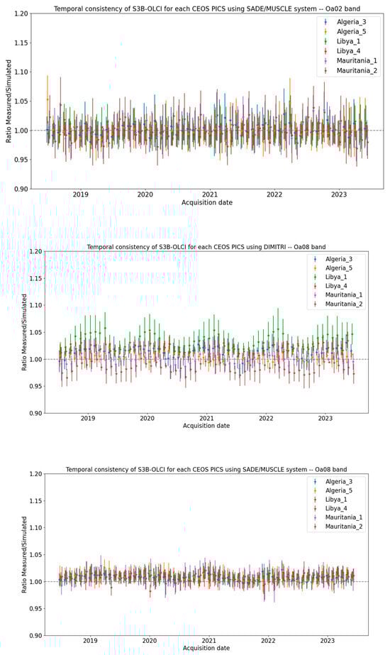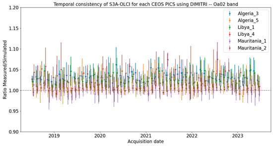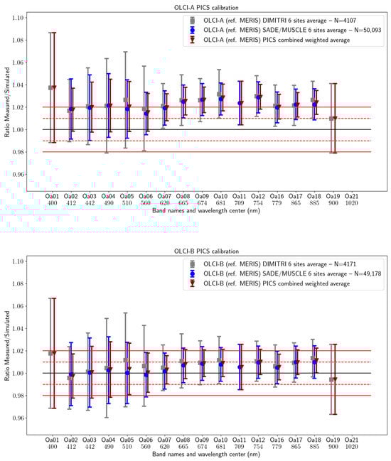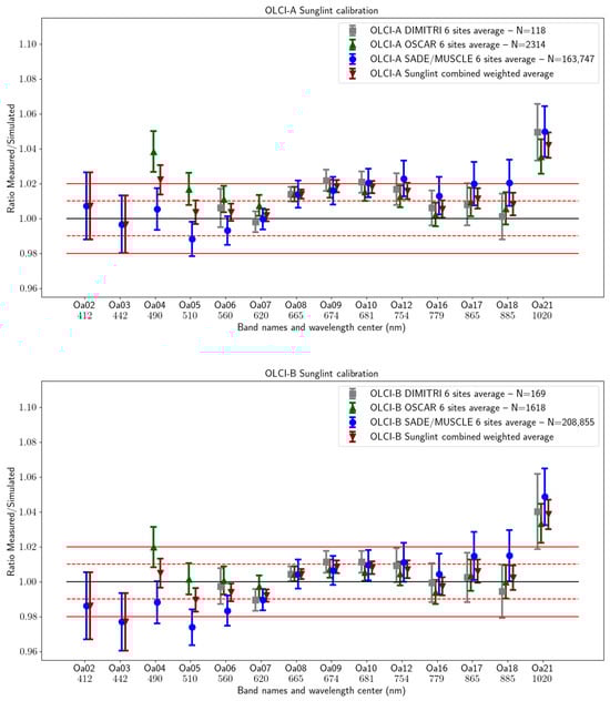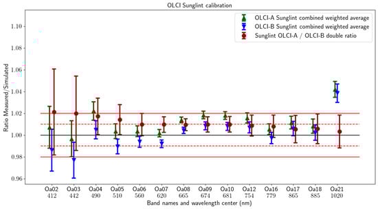 The temporal average of the elementary ratios (observed TOA-reflectance to the TOA-simulated one) over the period of July 2018–June 2023 for OLCI-A shows gain values between 2% and 3% over all the VNIR bands (Figure 6). Improbably, the temporal average of the monthly ratios for OLCI-B shows gain values within 1% (2% is the mission requirement) over the VNIR spectral range except band Oa01 (Figure 6). The spectral bands with significant absorption from water vapor and O2 (Oa11, Oa13, Oa14, Oa15, and Oa20) are excluded. Thus, this shows that there is a 1% to 2% bias between OLCI-A and OLCI-B. One might keep in mind that both software/databases DIMITRI and SADE/MUSCLE use MERIS as a reference sensor (see Section 2.4.1 and Section 2.4.3).