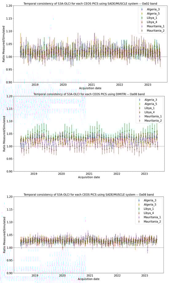 Figure 4 and Figure 5 display the DIMITRI and SADE/MUSCLE monthly time-series of the ratios of TOA-observed over TOA-computed for each site (different colors). The results are consistent over all the used PICS, where both sensors show similar behaviors and good stability—no trend detectable—over the analyzed period. In general, we observe trends of less than 0.08, except bands Oa6 and Oa7 from SADE/MUSCLE which show slightly higher trends of about 0.11 up to 0.15, respectively (Table 4). Despite the good stability over all the time-series, one may observe stronger seasonal variability over DIMITRI results, unlike those of SADE/MUSCLE. Also, differences could be observed over the different sites with band dependency (see Appendix A, Figure A1 and Figure A2).