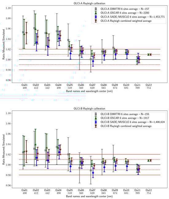 The Rayleigh method was performed by the three software/database kits over the available acquisitions over July 2018–June 2023 from OLCI-A and OLCI-B. The gain coefficients of OLCI-A are consistent over the different sites, while a slight discrepancy could be observed between the northern/southern hemispheres. Bands Oa01–Oa05 display bias values between 5 and 7%, while bands Oa06–Oa12 exhibit biases between 2 and 3% (Figure 7). The gain coefficients of OLCI-A are higher than the OLCI-B ones, where bands Oa01–Oa05 display bias values of about 3–5%, while bands Oa6–Oa12 exhibit biases better than the 2% absolute radiometric accuracy requirement for these bands (Figure 7).
