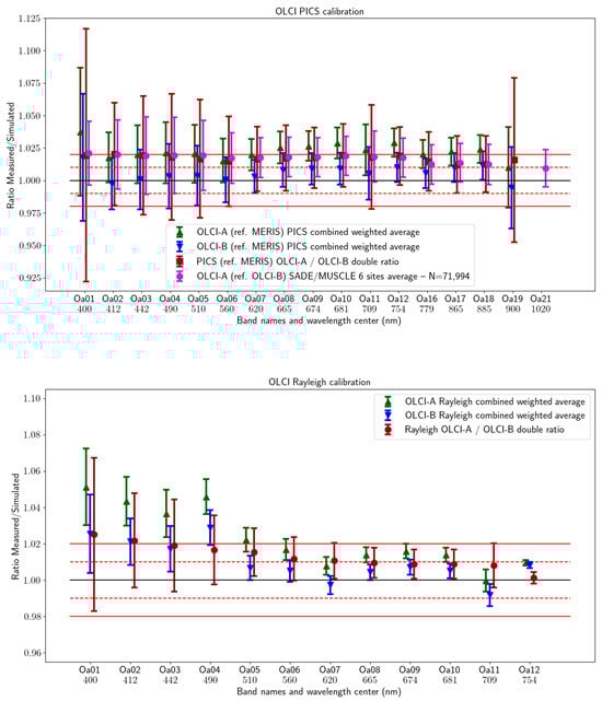 The observed differences for the shortest wavelength bands (c.f. Oa01–Oa05; see standard deviation) could be partially attributed to the sensor’s sensitivity to light polarization, given that Rayleigh scattering is highly polarized. However, this is not the only possible explanation. If we consider instrumental effects, discrepancies between the Rayleigh and desert methods could also arise from sensor non-linearity, as Rayleigh calibration is performed over a dark target, whereas desert calibration uses a much brighter reflectance. Another possible cause is the stray light issue, as discussed in [28] on PARASOL/POLDER 443 nm band. Beyond instrumental factors, methodological uncertainties could also contribute to these differences, in particular marine reflectance, atmospheric modeling, chlorophyll variations, etc. This is confirmed by the difference between the standard deviation values and the method uncertainty, where the latter’s values are systematically higher than the former’s values (seventh and eighth columns in Table 5).