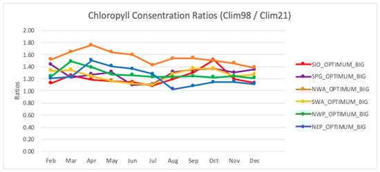 The ratios of the monthly climatology of the chlorophyll concentration as Clim98/Clim21 (current climatology/recent climatology) per month per site (see Table 2).