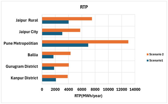 Figure 5 reveals the estimated rooftop PV potential in MWh/year for the cities of interest using Equation (5). The computation yields the maximum rooftop PV potential of nearly 6970.66 ± 751.38 (13,005.65 ± 1210.71) MWh/year over the Pune metropolitan city and a minimum of ~1723.10 ± 254.14 (4306.34 ± 381.85) MWh/year over Ballia based on scenario 1 (scenario 2). Both scenarios showed a highly significant difference in RTP between Jaipur’s rural and urban areas within the western zone cities; the rural RTP was nearly 31% higher. Here, possible errors in the RTP estimates occur due to the variability of the GHI and Tcell variables in Equation (5). Here, Tcell depends on the city’s average temperature, i.e., Tai. The studies suggest that the standard deviation of the temperature climatologies throughout India typically falls between 0.5 °C and 1.5 °C, varying by the region and the period examined [90]. Therefore, we have considered the average limit, i.e., ~1 °C, that was taken here for the present study. Moreover, the standard deviation associated with the average annual GHI values for the cities is 182.5 to 365.0 kWh/m2/year, as per reports and research articles [89,91,92]. The variation of these variables to overall RTP estimates has been addressed by computing the propagation error using the (A1a,b) mentioned in Appendix A section. The results emphasize the tremendous scope of harnessing energy from rural areas of the country via optimum solar planning. The following important finding is that the Kanpur District has a higher RTP, even though the Gurugram has skyscraper buildings.