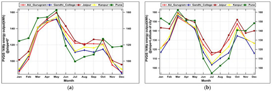The monthly variation of energy production per 1 kWp PV system (a) at zero and (b) the optimum latitude slope from PVGIS over polluted Indian cities.