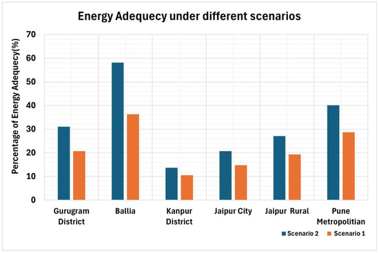 Moreover, we estimated the energy adequacy for the cities as portrayed in Figure 7, computed using Equation (8). The energy adequacy in rural areas, such as Ballia, is the maximum (~58%) compared to all of the cities and Jaipur rural, especially when contrasted with Jaipur City. The reason for the significant high-energy adequacy might be a lesser energy consumption than the possible energy production capacity. However, both the cities, Kanpur and Ballia, are located in a similar geographical zone, Central IGP; Ballia has an energy adequacy nearly three times that of Kanpur. Being industrial, Kanpur has a higher energy consumption and a more significant population density than Ballia. Next to Ballia, we observed a higher energy adequacy of ~40% over Pune metropolitan city. The higher energy adequacy observed in Pune can be attributed to its maximum energy production capacity, which results in the most significant building footprint area compared to the other cities. Gurugram city has an energy adequacy of ~31%, with an RTP of ~4036 MWh/year. Although the city has a multistory building, it is still in the development phase; thus, in the future, the city might have an enormous potential for solar power in North India. While energy adequacies are lower in scenario 2 than in scenario 1, the overall trend remains consistent across all of the cities. This discrepancy may arise because scenario 2 presents a more realistic approach by carefully incorporating rooftop morphological factors, making it more robust than the other scenarios. A detailed energy planning analysis might be used to develop rooftop solar potential maps that focus on the government’s interest in making smart cities. Moreover, the results of the investigation help establish the RTP map and mitigate climate change over the IGP, known as the “food bowl” of the Indian region [95]. The results obtained from the extensive study are pretty helpful for the policymakers and stakeholders, and the better implementation of govt solar rooftop schemes such as Pradhan Mantri Surya Ghar Muft Bijli Yojna (PMSY). The details of this scheme are here, with the link [96].