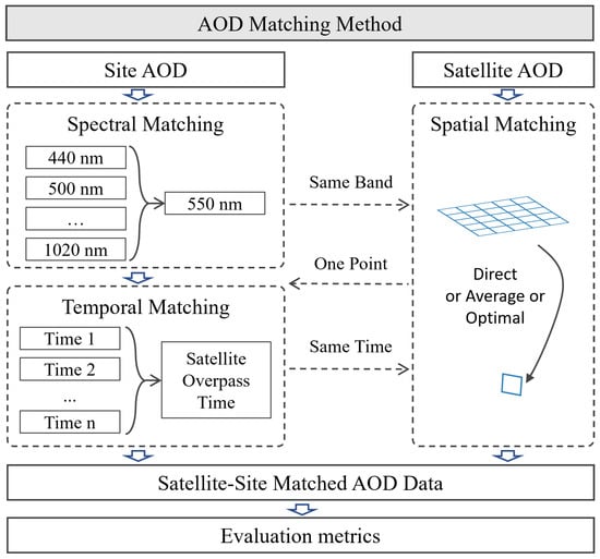 A specific pairing between a satellite-retrieved AOD and a site-measured AOD is referred to as a matchup. Due to differences in measurement methods between satellite and ground-based instruments, their products vary in spectral wavelength, time, and spatial coverage. Direct matching between site-measured and satellite-retrieved AOD is not feasible; thus, some processing is required [,,], as shown in Figure 1.
