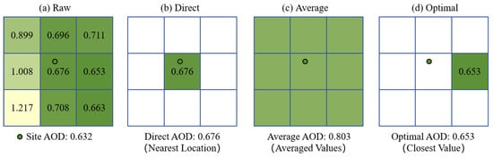 Schematic diagram of three spatial matching methods. Squares represent pixels, while circles indicate ground sites. The values within the squares correspond to the AOD (QA = 3) retrievals from MOD(DT) for the granule “MOD04_L2.A2015219.1120.061.2017322082600.hdf”. The site AOD represents measurements from the AERONET Granada site. In panel (a), different colors denote variations in AOD values between the site measurement and pixel retrievals. Panels (b–d) illustrate the AOD values after applying different spatial matching methods. The closer color similarity between pixels and the site indicates a smaller retrieval–measurement difference.