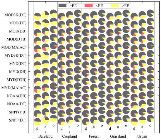 Comparison of AOD retrieval accuracy across different land cover types using various satellite aerosol products. Each pie chart represents the proportion of retrievals falling within (=EE, gray), above (>EE, yellow), or below (<EE, red) the expected error range (EE). The x-axis categorizes IGBP land cover types from the MCD12C1 product, with three spatial matching methods applied: direct (d), average (a), and optimal (o).