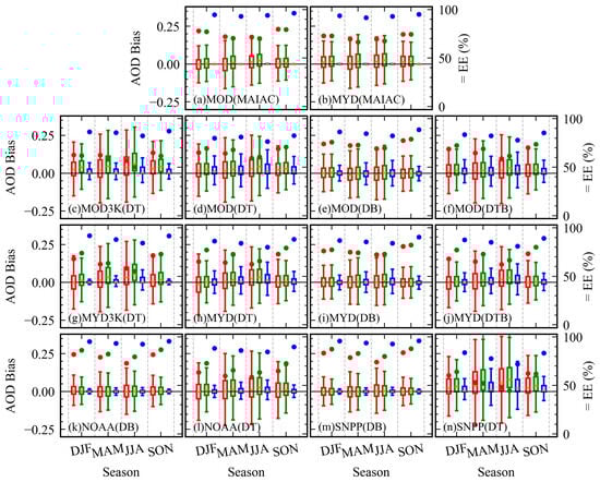 Seasonal variations in AOD bias for different satellite aerosol products and retrieval methods. Red, green, and blue represent the direct, average, and optimal spatial matching methods, respectively. The box plots illustrate the AOD bias distributions across four seasons: DJF (December–February), MAM (March–May), JJA (June–August), and SON (September–November). The right y-axis denotes the percentage of retrievals falling within the expected error (EE), with circular markers for each method.