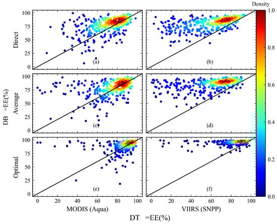 Comparison of =EE between DT and DB AOD products for MODIS (Aqua) and VIIRS (SNPP) under different spatial matching methods. The color scale indicates the density of data points, with red representing higher densities. The diagonal black line represents the 1:1 reference line, where DT and DB products have equal EE percentages.