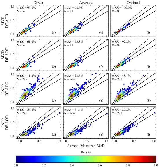 Table 3 presents validation results across different EE ranges to further support the previous conclusions. Four EE ranges are provided in the table. Here, “max (0.03;10%)” refers to selecting the larger value between absolute error and relative error as the EE range, which is narrower than the “(0.03 + 10%)” range. The results show that, although the EE percentage decreases across all products as the envelope range narrows, the previous conclusions remain valid. Additionally, the DT products, particularly those from VIIRS, perform poorly across different EE ranges. In contrast, the MOD(MAIAC) dataset consistently achieves the highest percentage under the “optimal” method, while the SNPP(DB) dataset performs best under the “direct” and “average” methods.